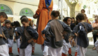 Els infants vesteixen pantalons blancs, camisola negra, mocador de fer farcells i camalls carbasses. Van acompanyats per la música de gralles i timbal.